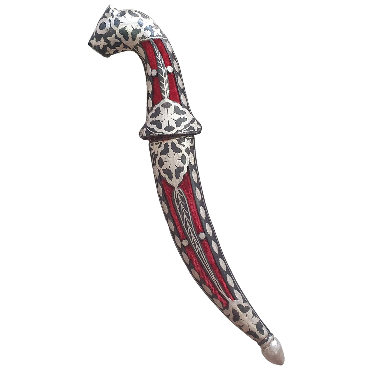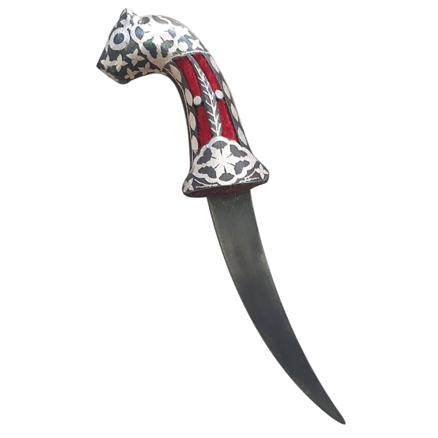 The handle is beautifully crafted with intricate patterns. In addition, the floral inlay design enhances its overall appearance. The combination of metallic tones with deep colors creates a striking visual effect.