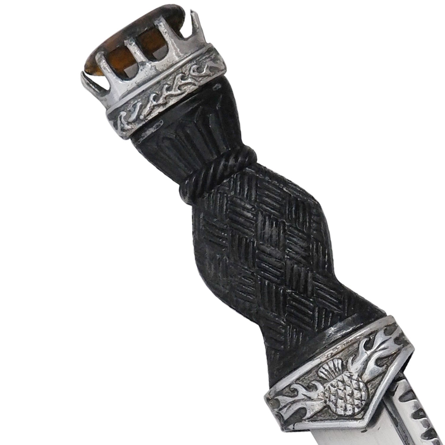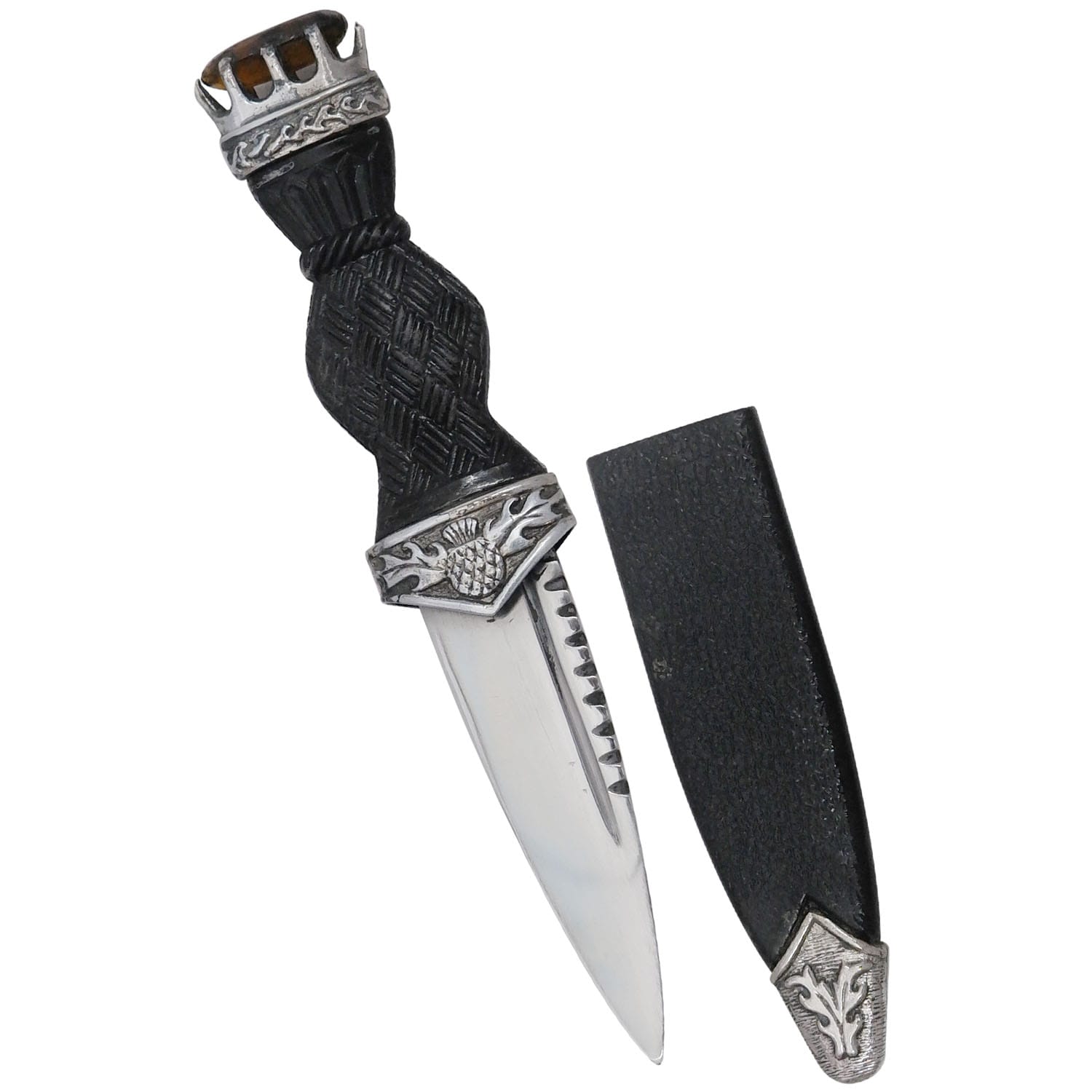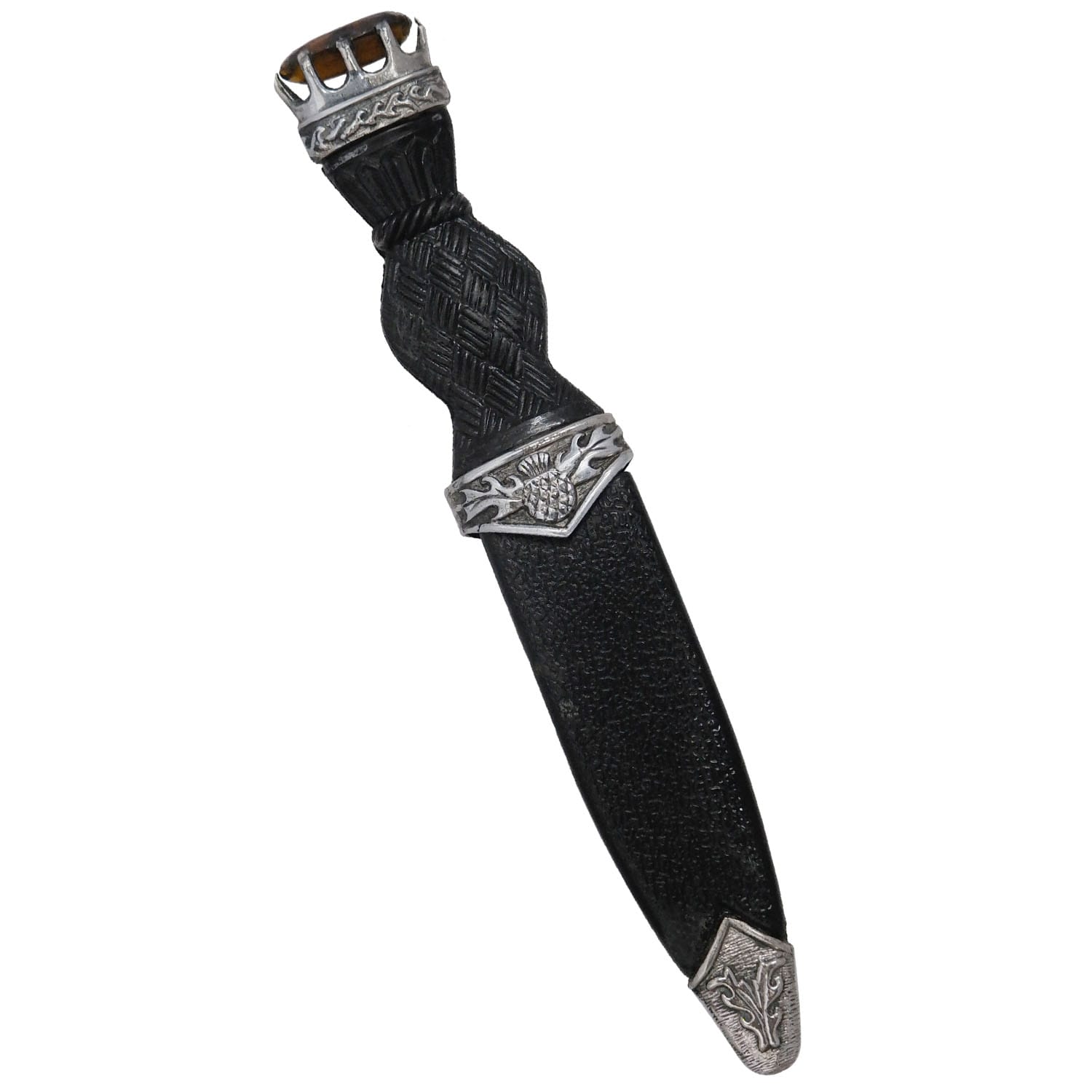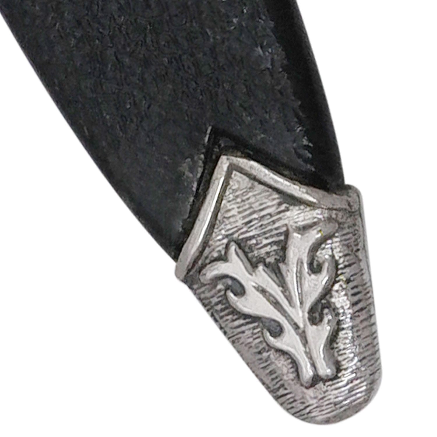 The Sgian Dubh is a small, single-edged knife traditionally worn as part of Scottish Highland dress. Its name, derived from Gaelic, means “black knife.” Historically, the Sgian Dubh was a concealed weapon, carried discreetly in the sock.