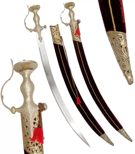 The SD224 Maratha Surai Khandar Sword is a distinctive Maratha sword. Most examples feature a blade that starts straight for about two-thirds of its length before curving gently toward the tip. Fully curved variants, though rare, are known to exist in 19th-century examples (Antique Swords). Another variant, the “Sosun Patta” style, includes an unusual inward edge and bulbous point—suggesting specialized or symbolic uses (Antique Swords).