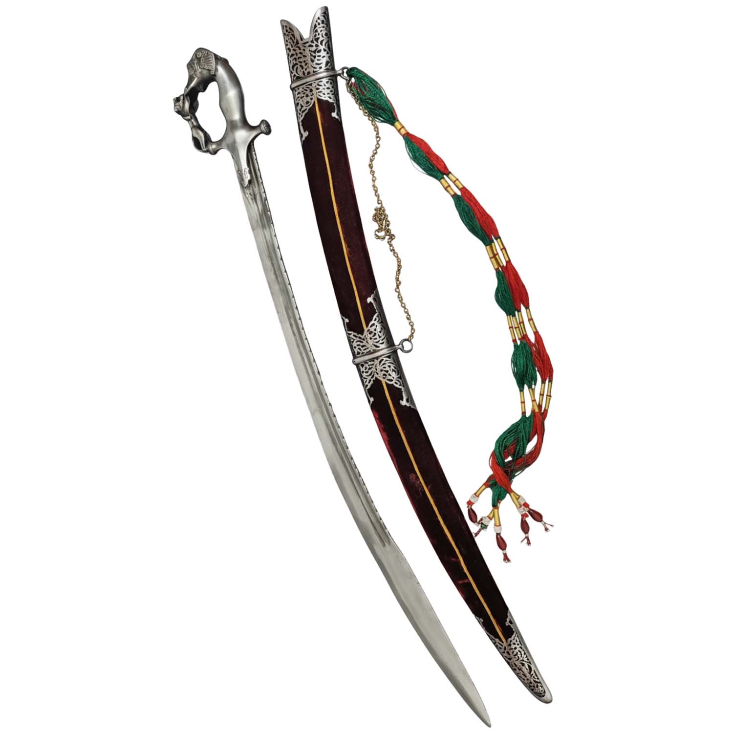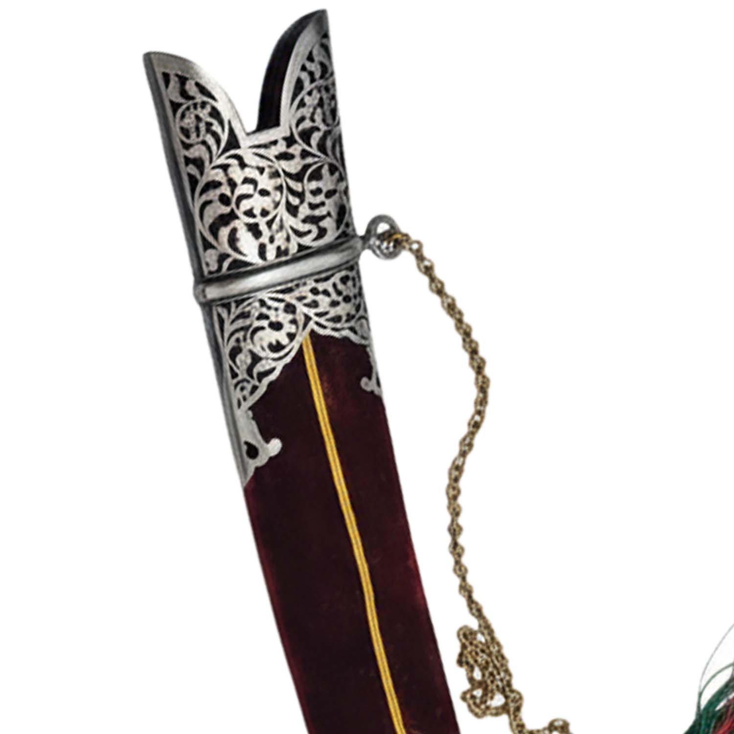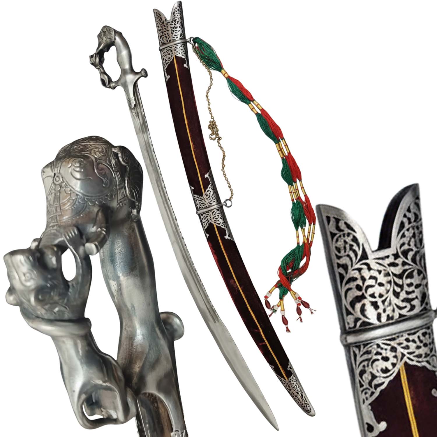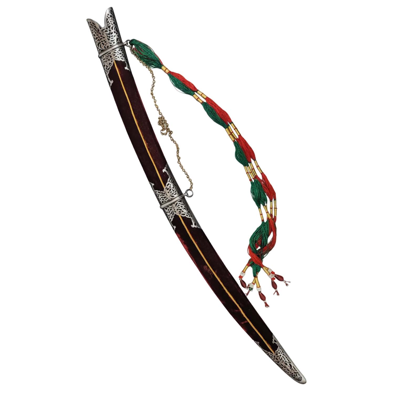 The SD241 Royal Silver Curve Sword features a smooth curved blade that reflects historic Persian and Mughal-style swords. Additionally, the silver-finished handle enhances its royal appearance. The sword comes with a finely designed sheath, decorated with elegant patterns and colorful hanging tassels. As a result, it looks impressive when displayed on walls or stands.